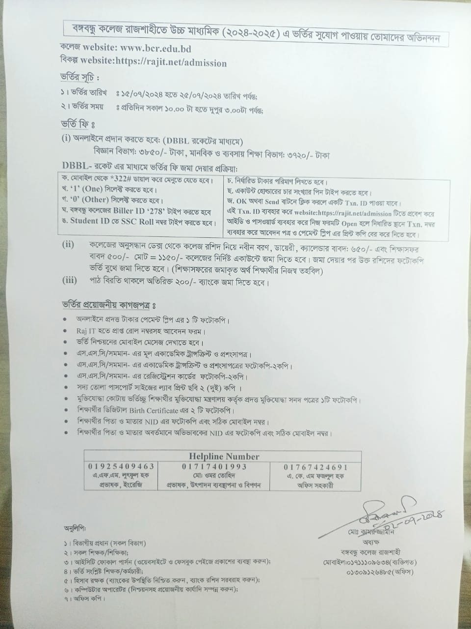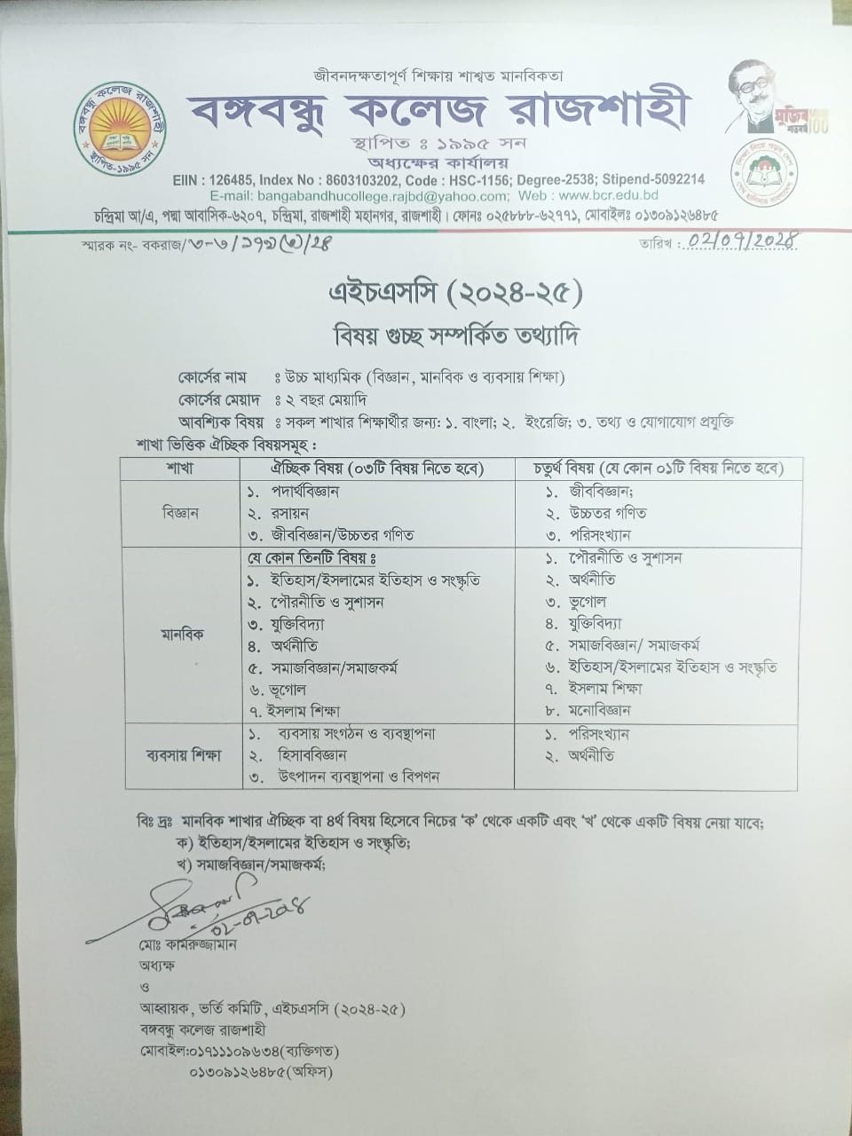 উচ্চ মাধ্যমিক (২০২৪-২০২৫) ভর্তি সংক্ৰান্ত বিস্তারিত তথ্য